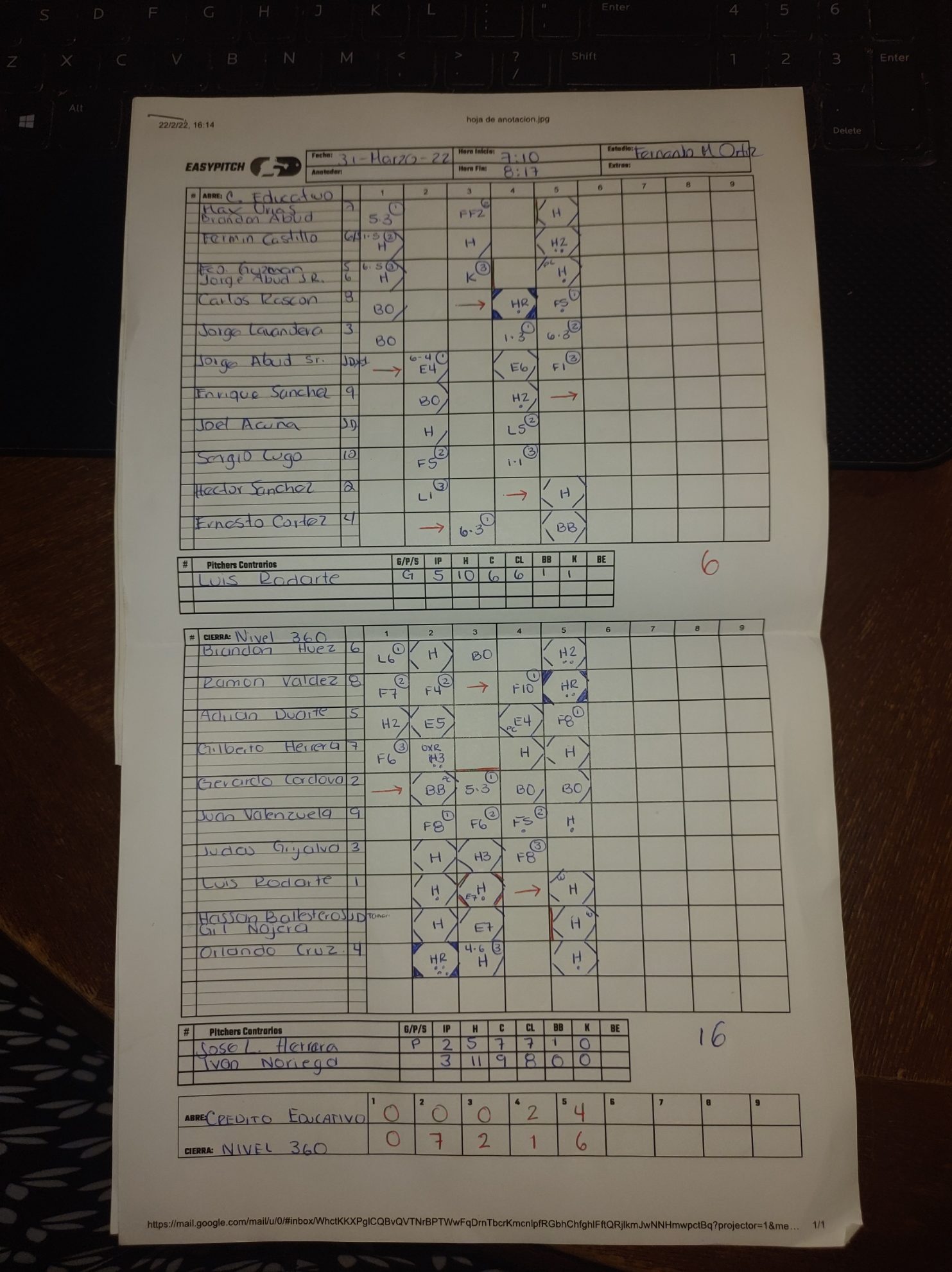 Jugador Position T TL C H RBI H2 H3 HR BR BB K E IP H CP CL BB K HR Ganador Perdedor