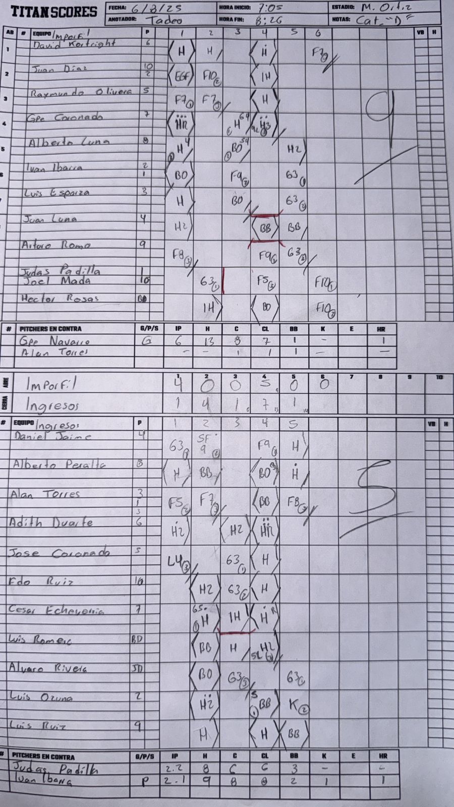 Adan Alberto Torres Robles | Pitcher | 4 | 3 | 1 | 0 | 0 | 0 | 0 | 0 | 0 | 1 | 0 | 0 | 0 | 0 | 1 | 1 | 1 | 0 | 0 | 0 | 0 |