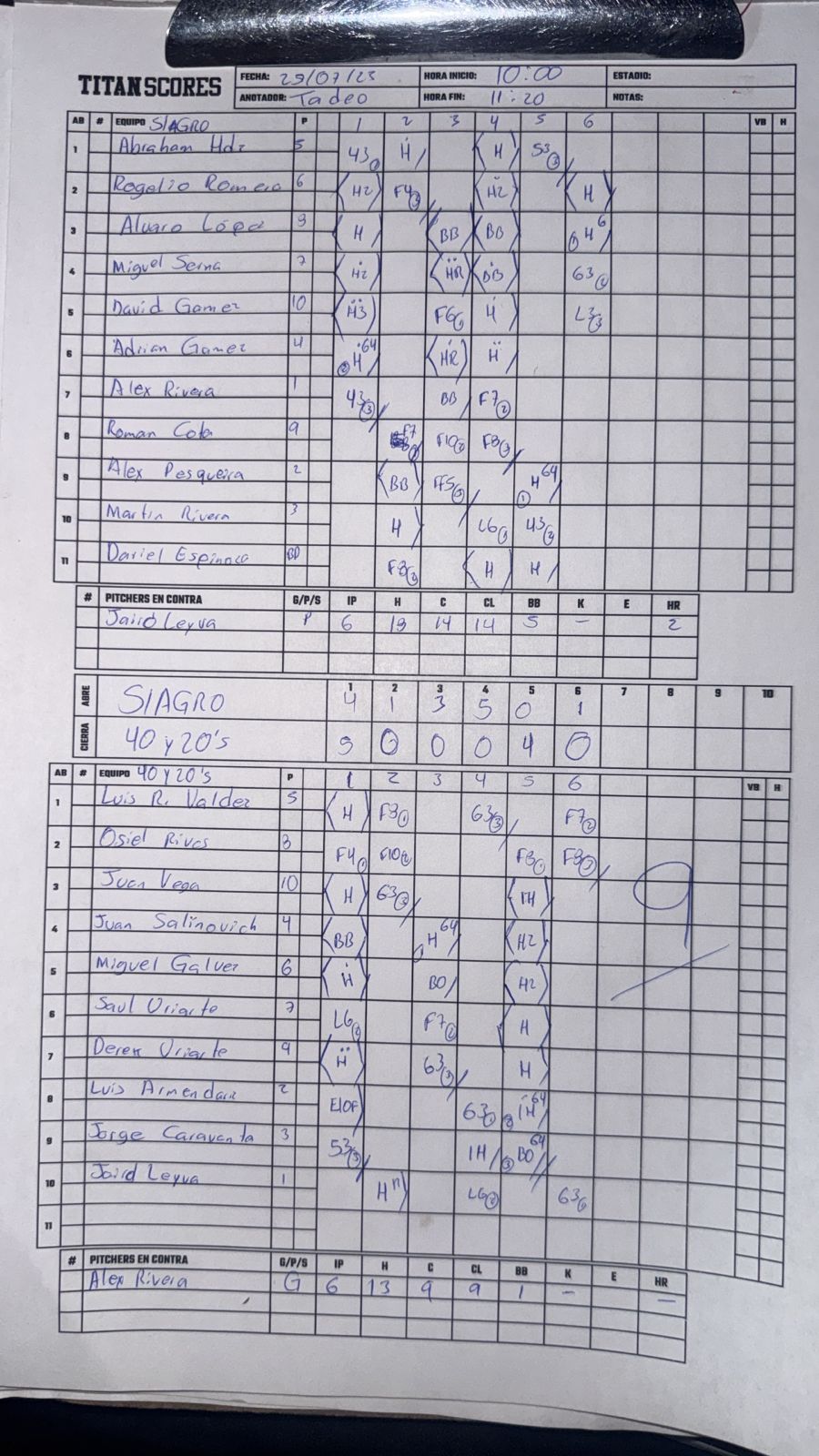 Jugador | Position | T | TL | C | H | RBI | H2 | H3 | HR | BR | BB | K | E | IP | H | CP | CL | BB | K | HR | Ganador | Perdedor |