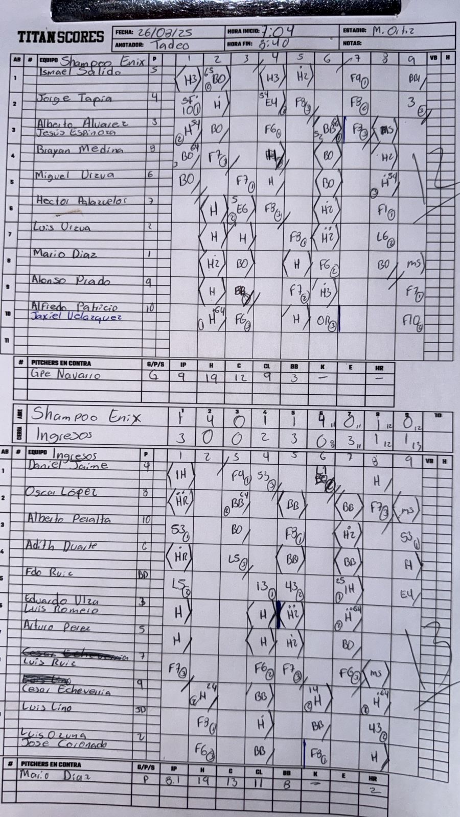 Jugador | Position | T | TL | C | H | RBI | H2 | H3 | HR | BR | BB | K | E | IP | H | CP | CL | BB | K | HR | Ganador | Perdedor |