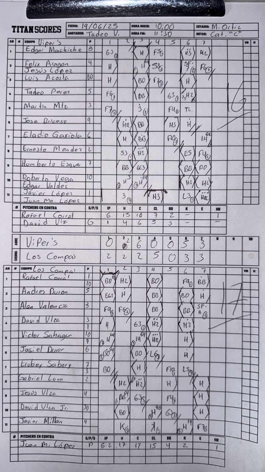 Jugador | Position | T | TL | C | H | RBI | H2 | H3 | HR | BR | BB | K | E | IP | H | CP | CL | BB | K | HR | Ganador | Perdedor |
