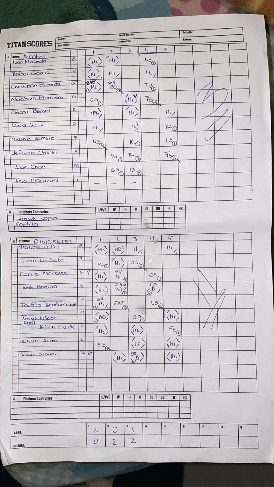 ALCOHOL vs DISIDENTES vs Recap Detalles Fecha Tiempo League Temporada 18 noviembre, 2025 9:15 pm CATEGORIA C 2025 Lugar Deportivo Coloso Calle Nueva Circumbalacinn y Circumbalacinn, Coloso, 83040 Hermosillo, Son., México ResultadoEquipo12345RALCOHOL201003DISIDENTES4220311 ALCOHOL Jugador Position T TL C H RBI H2 H3 HR BR BB K E IP H CP CL BB K HR Ganador Perdedor Julio Alonso Macazani GutierrezPitcher00000000000051611721201Christian Gabriel Miranda Lopez-330101000000000000000Jefferzon Gabriel Camou Chavez-330000000000000000000Jose Rafael Garcia Ortiz-331310000000000000000Vicente Romero Peralta-330000000020000000000Ivan Rodrigo Jimenez Miranda-331201000010000000000Oscar Francisco Bernal Arechiga-330300000000000000000Juan Antonio Chan-220000000000000000000David Alejandro Ruiz Hernandez-330211000010000000000Abraham Macazani Ornelas-331100000000000000000 Total 26263122300004051611721201 DISIDENTES Jugador Position T TL C H RBI H2 H3 HR BR BB K E IP H CP CL BB K HR Ganador Perdedor Jorge LopezPitcher0000000000003103202010Aaron CastilloPitcher000000000000220002000Ivan Olivas-322200000100000000000Fausto Bracamontes-330120000000000000000Carlos Morales-331200000000000000000Kevin Orduno-331211010000000000000Jorge Arturo Lopez-332100000000000000000Vladimir Villa-442441010000000000000Juan Pablo Soto-330100000010000000000Jose Badilla-321101000100000000000Julian Soto-332201000000000000000 Total 28261116740202105123204010 T 28 26 TL 26 26 C 11 3 RBI 7 2 H2 4 3 H3 0 0 BR 0 0 E 0 0 IP 5 5 H 12 16 CP 3 11 CL 2 7 BB 0 2 K 4 1 HR 0 2 Ganador 1 0 Perdedor 0 1