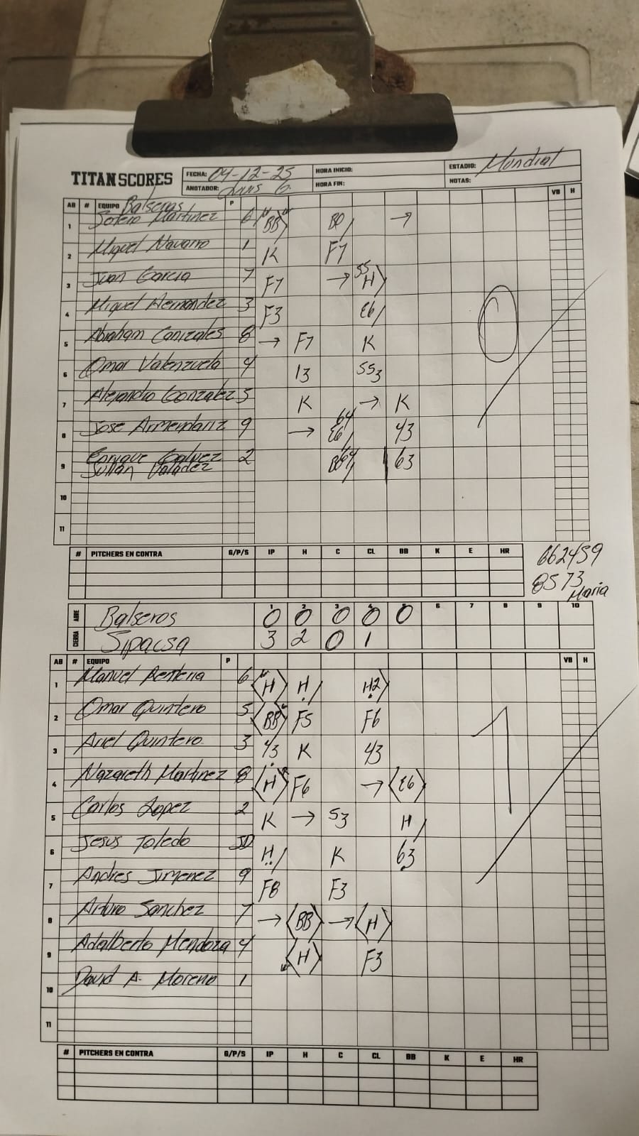 BALSEROS vs SIPACSA vs Recap Detalles Fecha Tiempo League Temporada 4 diciembre, 2025 9:15 pm CATEGORIA C 2025 Lugar Mundialistas C. Jose Carmelo 4253, Pimentel, 83188 Hermosillo, Son., Mexico ResultadoEquipo12345RBALSEROS000000SIPACSA320117 BALSEROS Jugador Position T TL C H RBI H2 H3 HR BR BB K E IP H CP CL BB K HR Ganador Perdedor Miguel Angel Navarro GutierrezPitcher220000000010587623001Alejandro Gonzalez Velasco-220000000020000000000Jesus Abraham Canizales Cordova-220000000010000000000Omar Valenzuela Silva-220000000000000000000Juan Manuel Vazquez Garcia-220100000000000000000Jose Luis Armendariz Rendon-220000000000000000000Miguel Hernandez Santillan-220000000000000000000Sotero Martinez Virgen-210000000100000000000Enrique Galvez Felix-110000000000000000000Julian Valadez Campa-110000000000000000000 Total 18170100000140587623001 SIPACSA Jugador Position T TL C H RBI H2 H3 HR BR BB K E IP H CP CL BB K HR Ganador Perdedor David Arnulfo Andrade MorenoPitcher000000000000510014010Jesus Toledo-330130000010000000000Jesus Andres Jimenez Chavez-220000000000000000000Adalberto Mendoza-221100000000000000000Arturo Sanchez-212100000100000000000Ariel Quintero Garcia-330010000010000000000Omar Quintero-321000000100000000000Jesus de Nazareth Martinez Aguirre-332100000000000000000Carlos Lopez Rico-330100000010000000000Manuel Renteria Benitez-331321000000000000000 Total 24227861000230510014010 T 24 18 TL 22 17 C 7 0 RBI 6 0 H2 1 0 H3 0 0 BR 0 0 E 0 0 IP 5 5 H 1 8 CP 0 7 CL 0 6 BB 1 2 K 4 3 HR 0 0 Ganador 1 0 Perdedor 0 1
