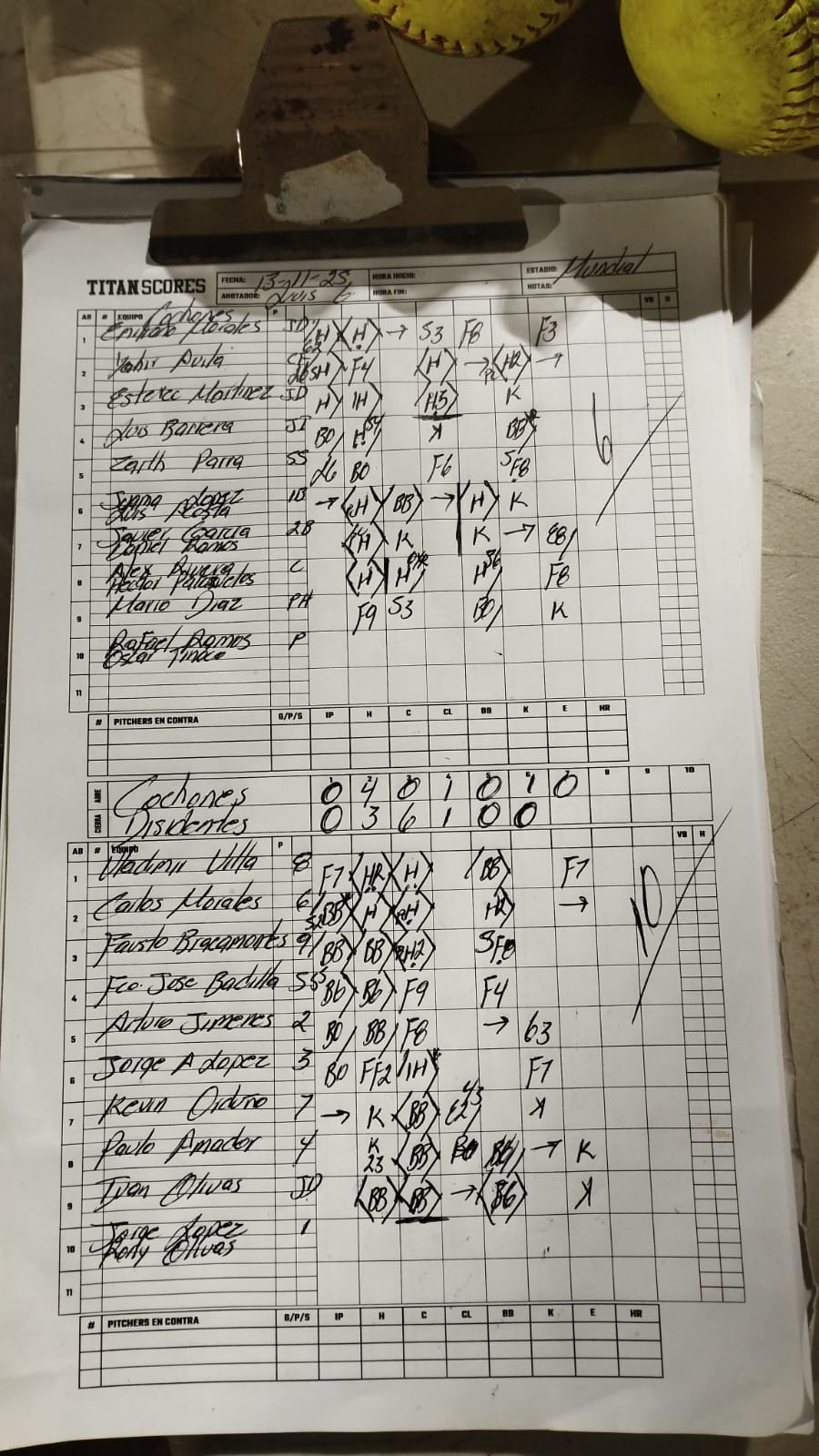 | COCHONES SOFTBALL GANG | 0 | 4 | 0 | 1 | 0 | 1 | 0 | 6 |