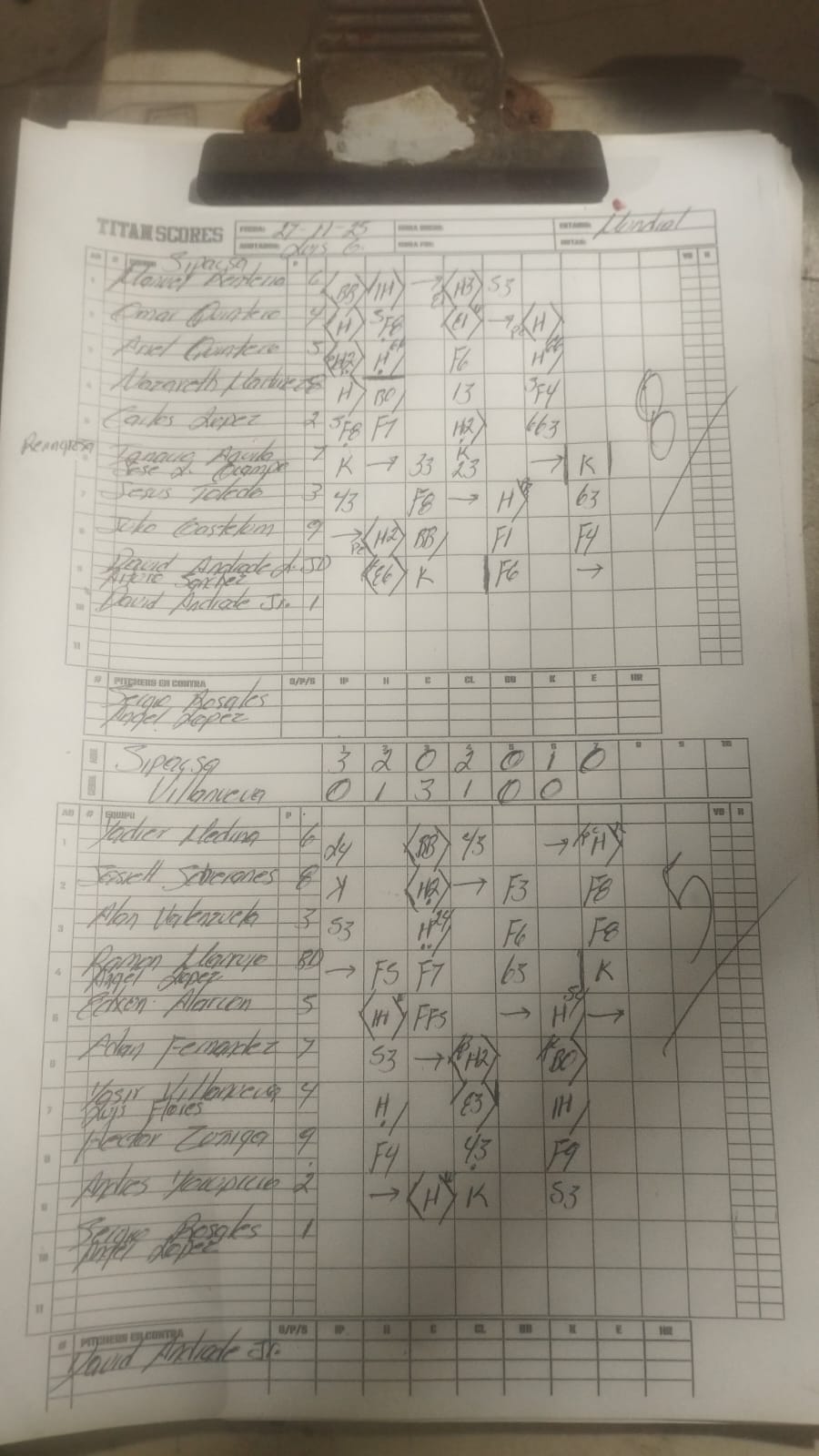 Jugador Position T TL C H RBI H2 H3 HR BR BB K E IP H CP CL BB K HR Ganador Perdedor